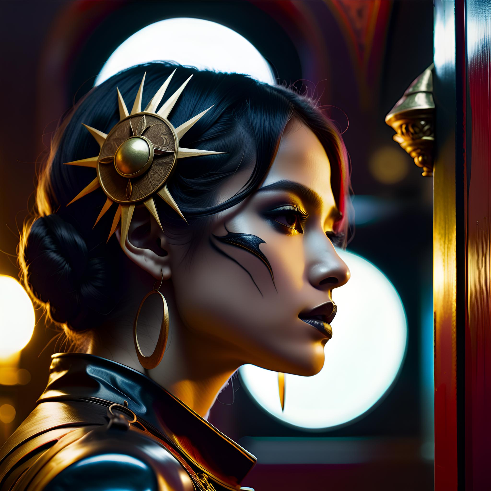 - Contemporary poster art featuring a profile captured in a detailed lithograph with fine coal texture, tar and vinyl color palette, set against a Chiaroscuro environment with layered depth composition, etched outlines within a chromatic Renaissance setting, continent fictional astrology elements in a Chiaroscuro daydream shelter, circuitry tone resembling emphatic expanded horror themes, utilizing both palette knife and brush strokes, matte finish, realized in cinematic abstractions, 8K resolution, 36.5 mm