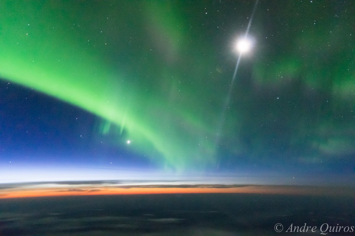 My view of the #AuroraBorealis, #Moon and #Venus, this morning from 35,000ft over western #Canada An wonderful nature show. @StormHour<br>http://pic.twitter.com/A7USsfsfkT