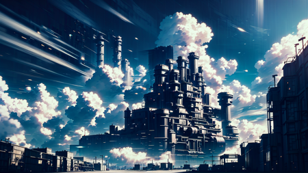 - awesomize, anime style, digital painting, noon, blue sky, clouds, scenery, "at the Moody Enigmatic Factory"